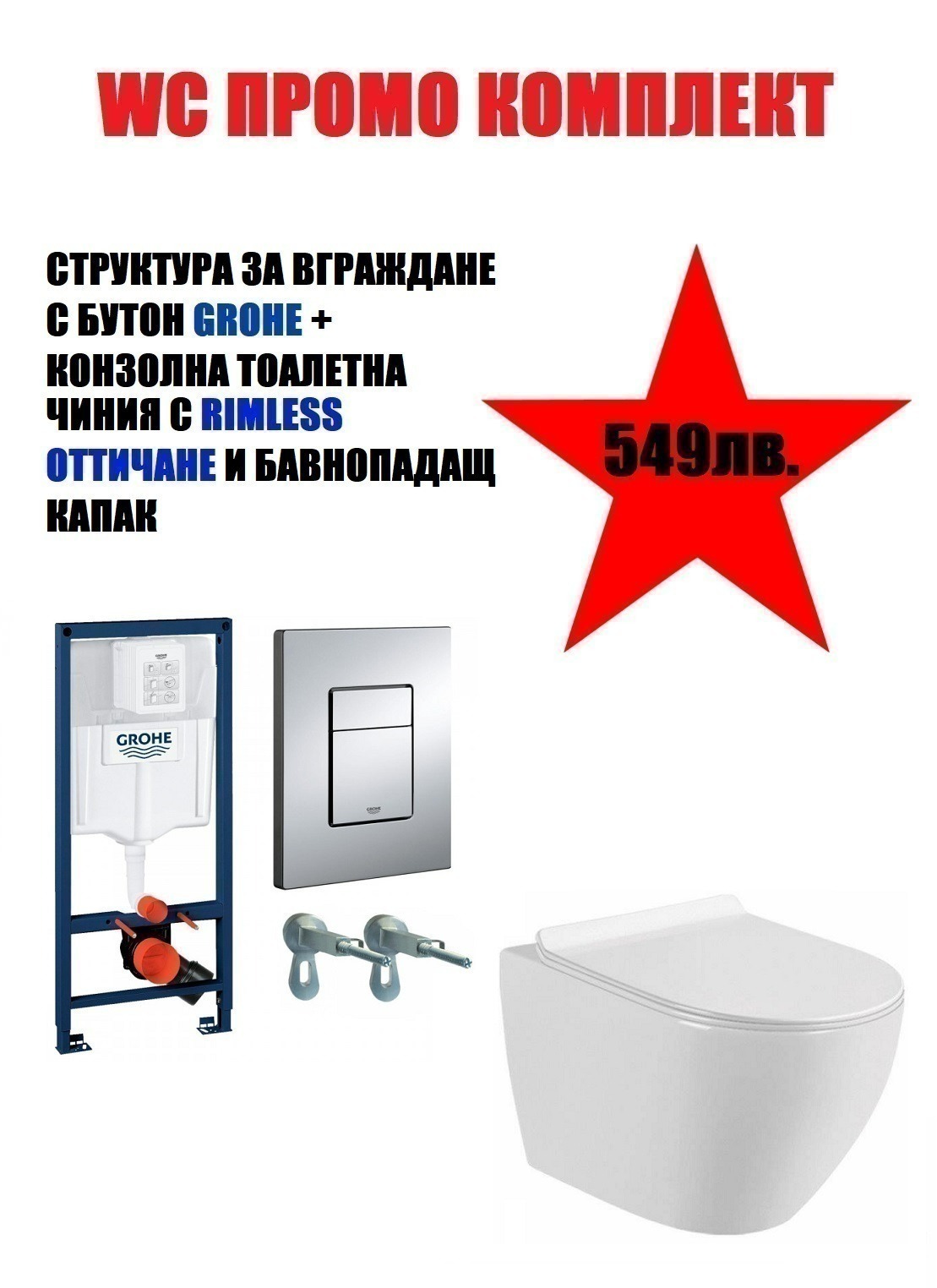 Този продукт е комплект, включващ структура за вграждане с бутон Grohe и конзолна тоалетна чиния C Rimless. Структурата е проектирана с висококачествени материали за дълготрайност и надеждност. Бутонът Grohe позволява лесно и удобно използване. Конзолната тоалетна чиния C Rimless е изработена с модерен и изчистен дизайн. Тя е оборудвана с функция за оттичане и специален бавнопадащ капак, който предотвратява внезапното и бързо затваряне на капака. Това е идеалният комплект за всяка модерна баня, като предлага комбинация от функционалност и естетика.
