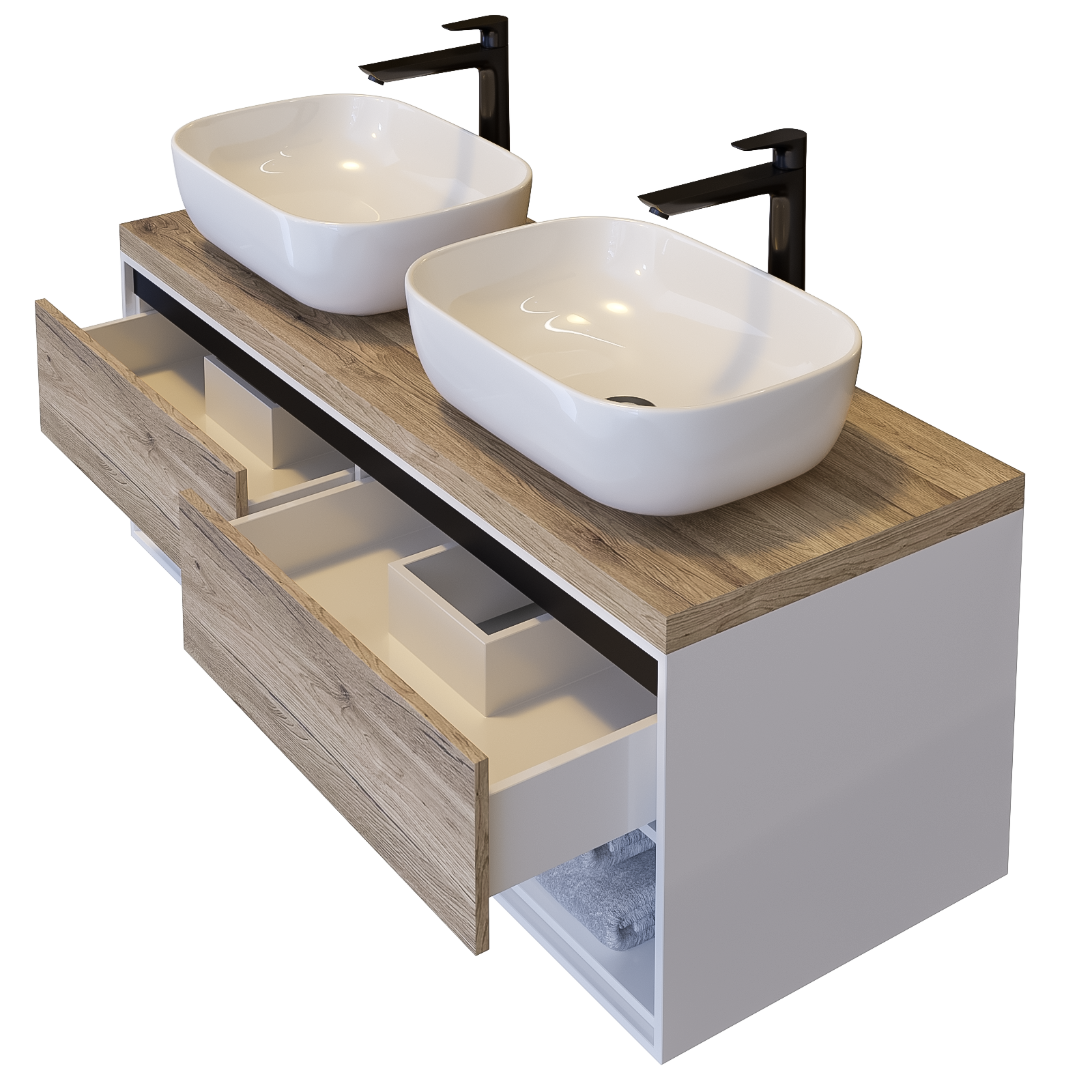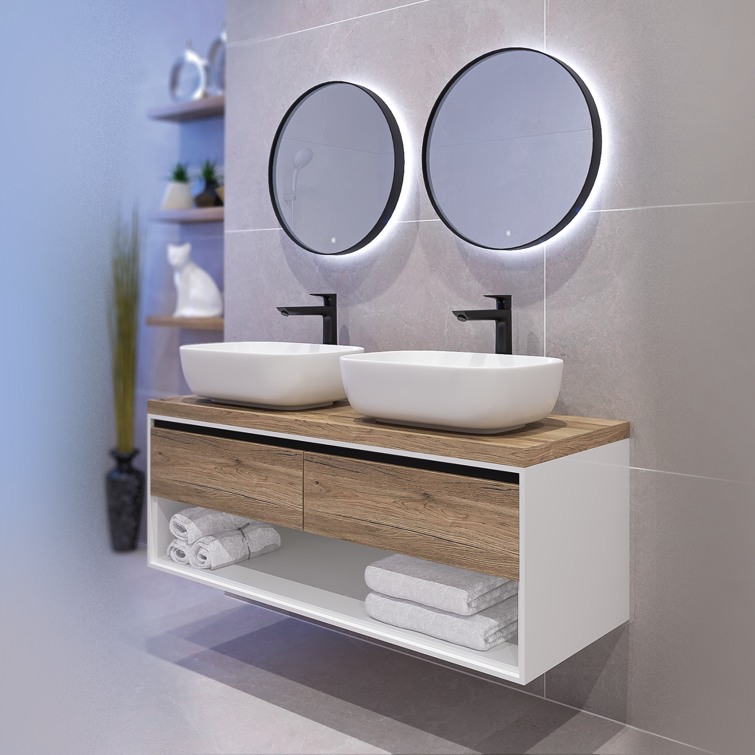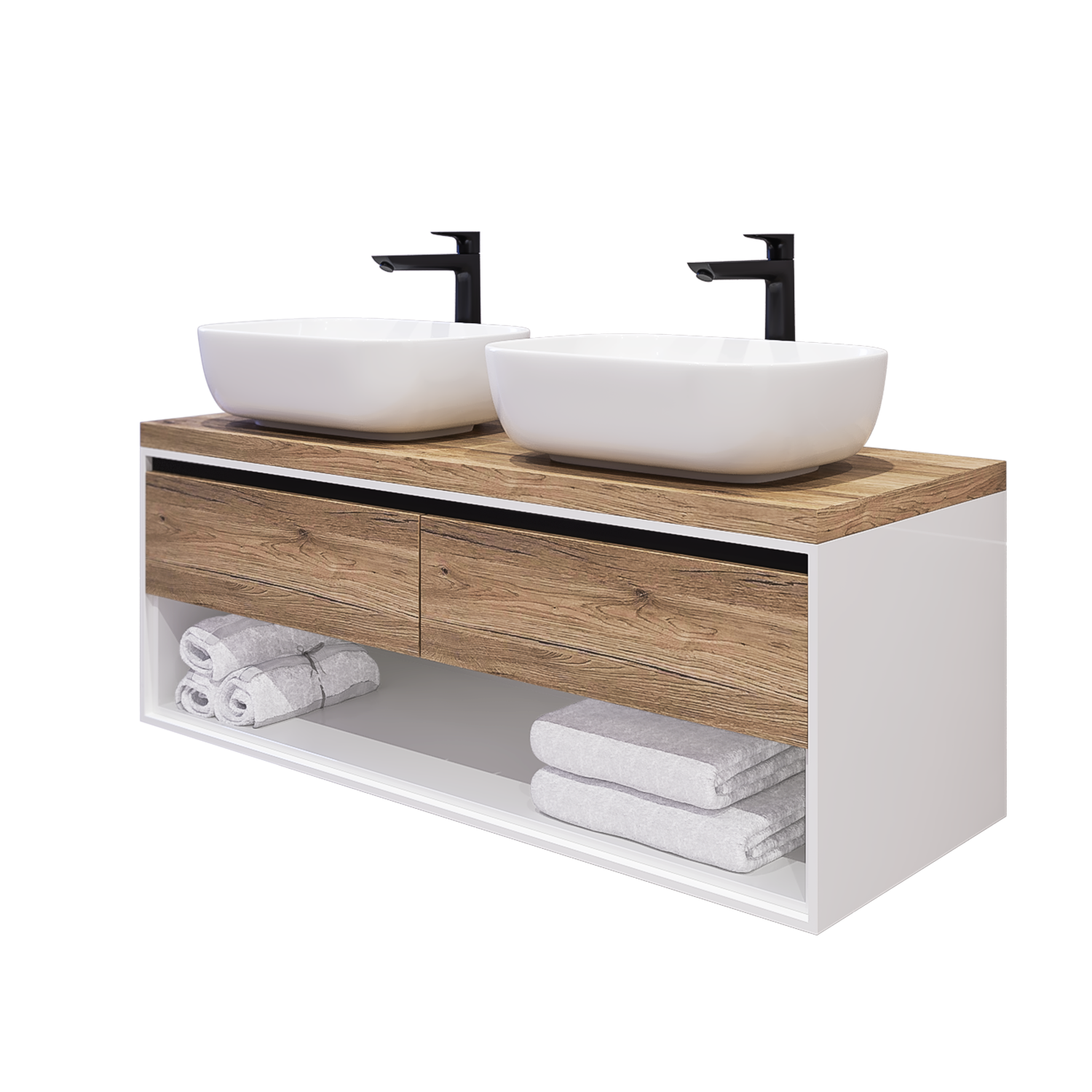 Изключително стилен водоустойчив шкаф за баня с две мивки – за нея и него! В модерни дървесни цветове и с практични чекмеджета с плавно затваряне.