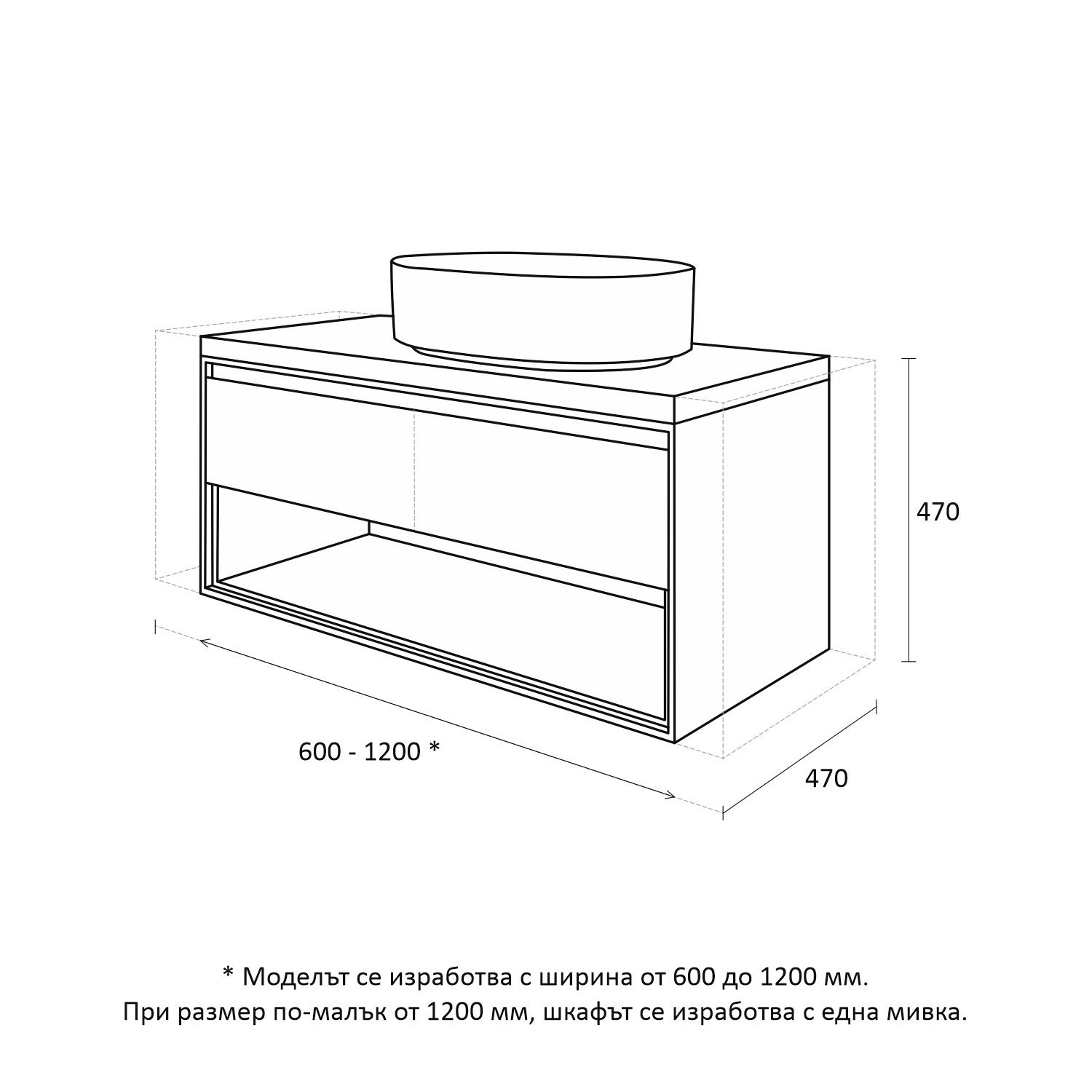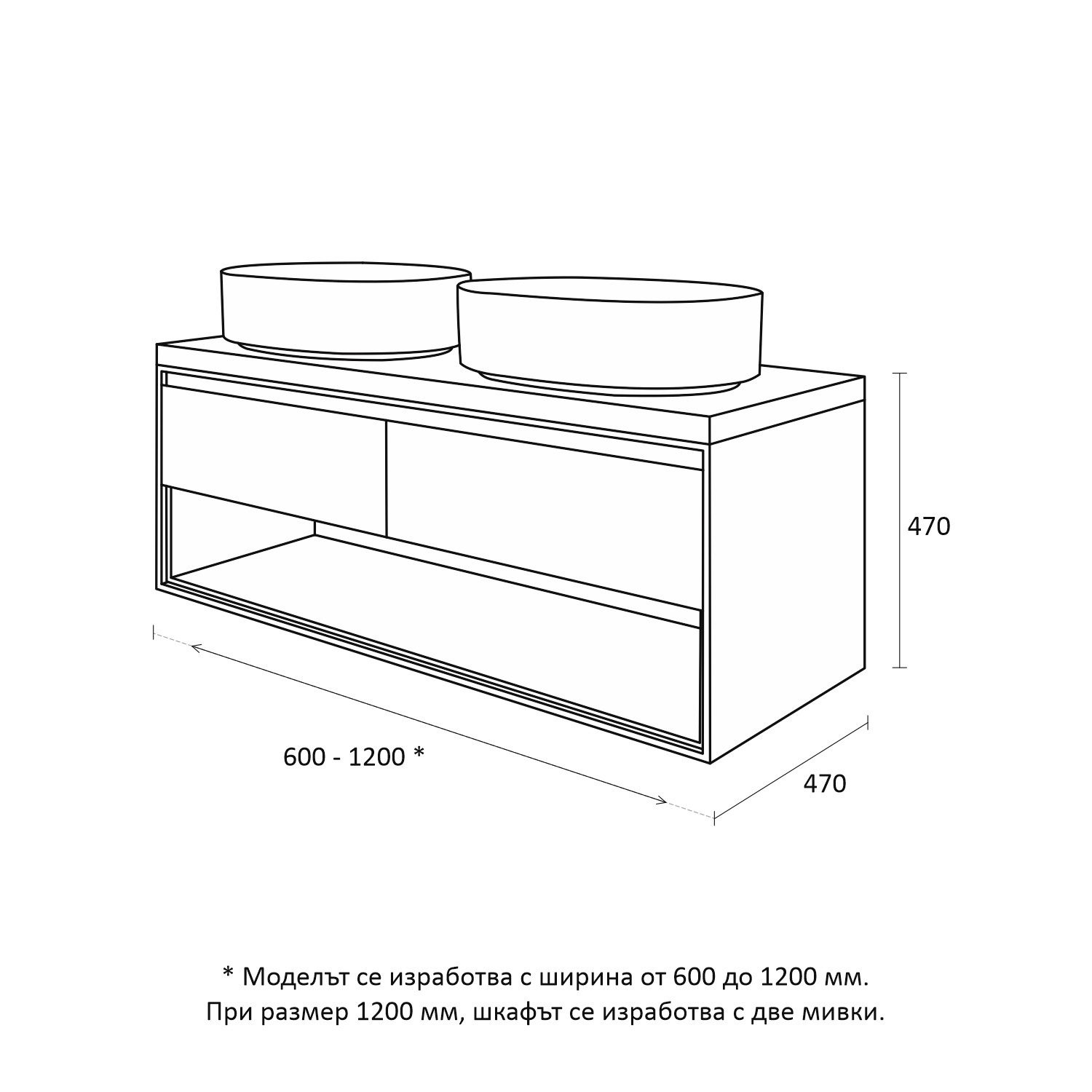 - Размери в мм: Ш – 1200 / В – 470 / Д – 470
