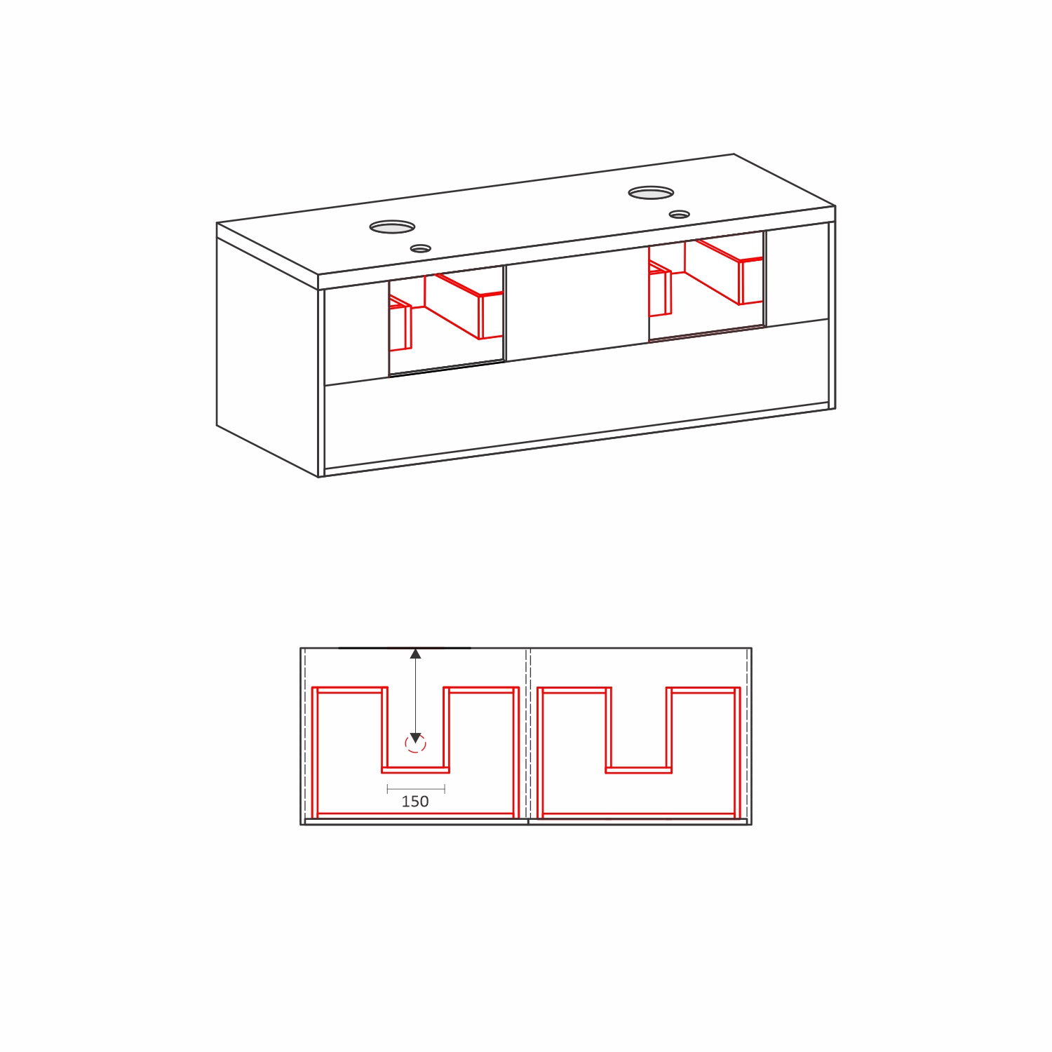 - При размер по-малък от 120 см шкафа се изработва с една мивка Moduo